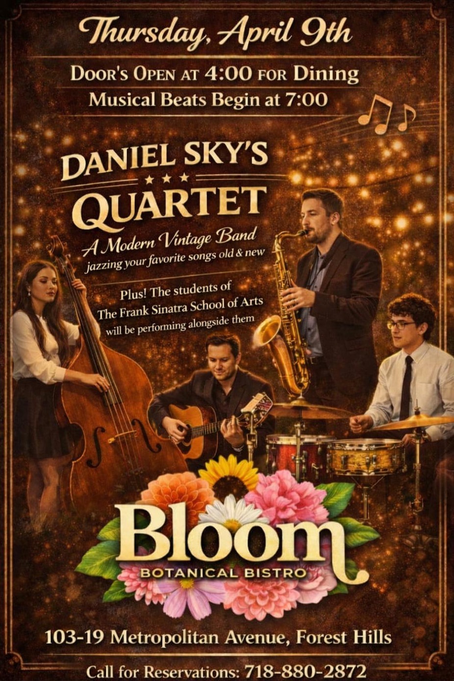 Special Live Jazz event with the Frank Sinatra School Of Arts High School musicians, complimented by Daniel Sky Trio! Make sure to RSVP in advance. Live Jazz Every Thursday Night!